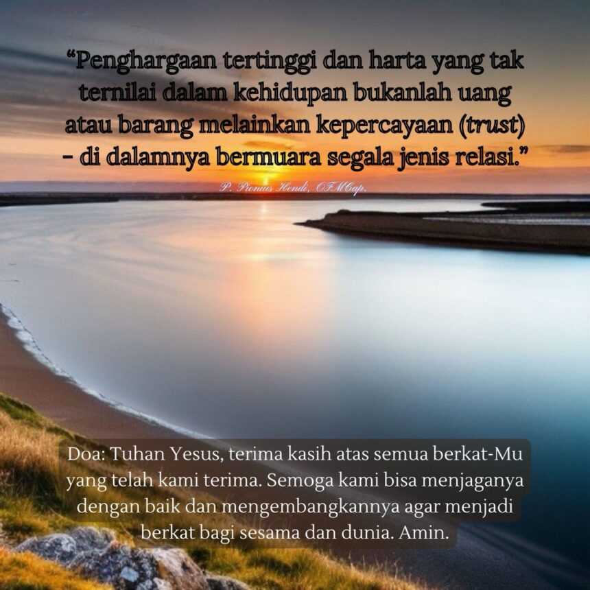 “Kepercayaan adalah pondasi hubungan yang kokoh dan mendalam. Tanpa kepercayaan, segala sesuatu menjadi rapuh dan tidak berarti,” ungkap Pastor Pionius Hendi OFMCap dalam poster yang dipostingnya hari ini, 22 Januari 2024.